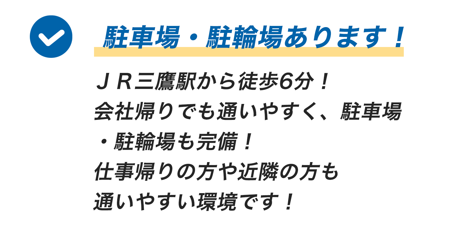 JR「三鷹」駅南口から徒歩6分です。駐車場と駐輪場がございます。