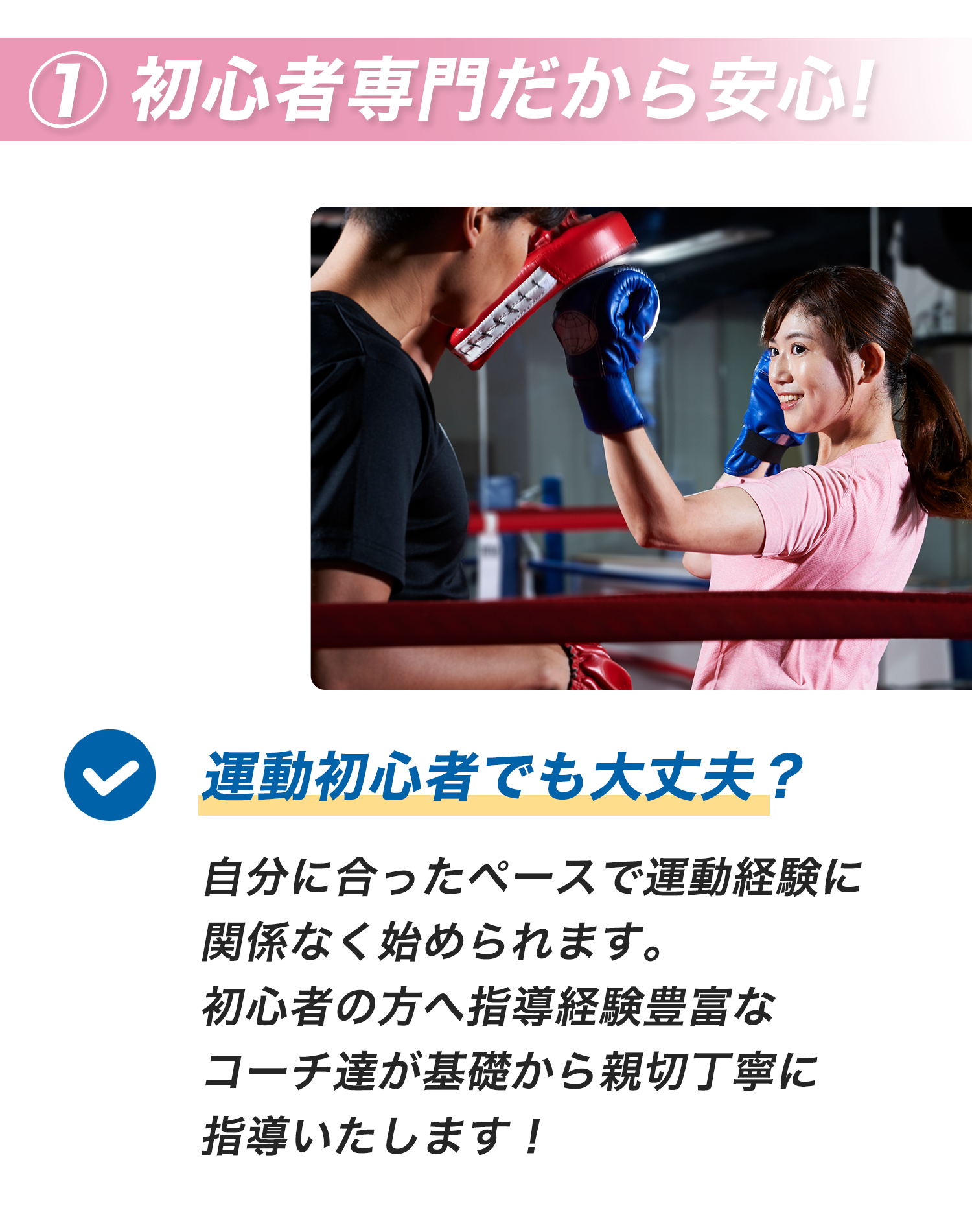 ご安心下さい。大歓迎です。初心者の方の為の小人数制度です。一人ひとりのレベルに合わせてコーチが基礎から丁寧に指導させて頂きます。